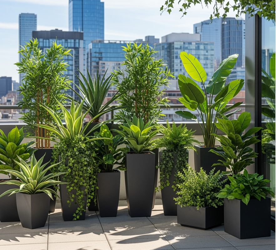 Styles are available in rich brass metals, botanical teak and can even be customized to match any RAL color on our light weight, polyester indoor planters.